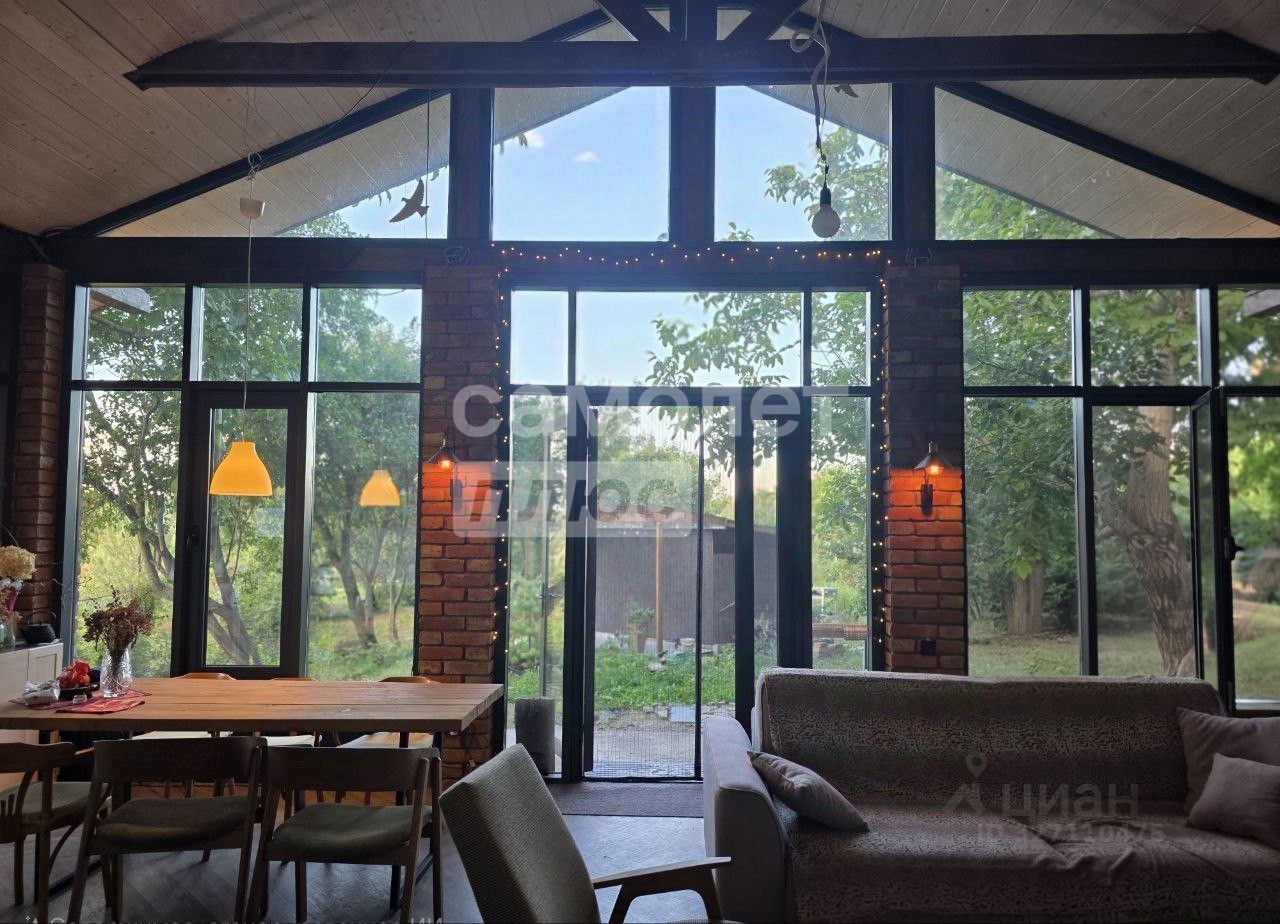 Просторная гостиная с большими стеклянными окнами открывает захватывающий вид на сад. В доме есть камин, сауна и дополнительный этаж с комнатой для отдыха. Теплый пол и газовое отопление обеспечивают комфорт.