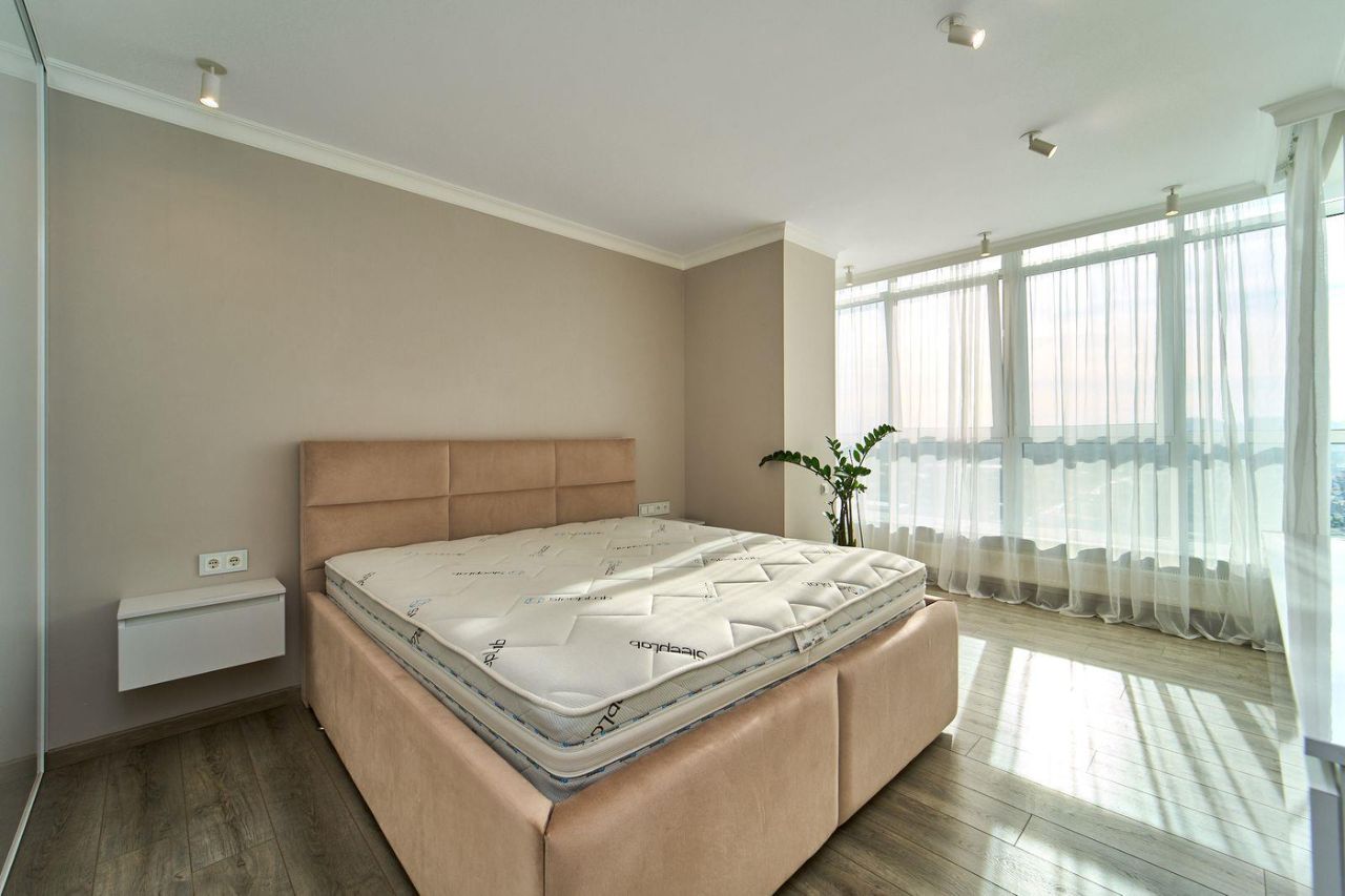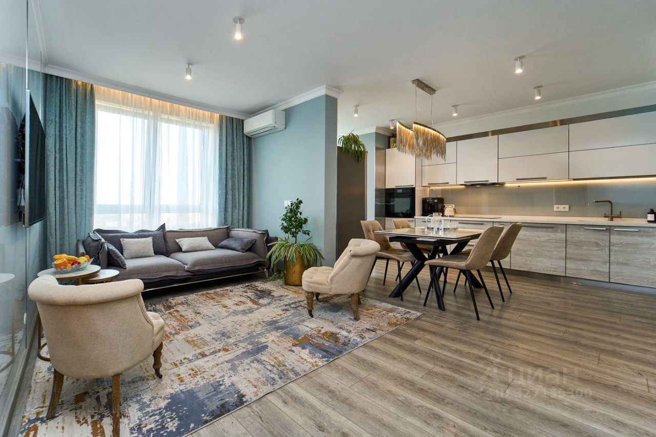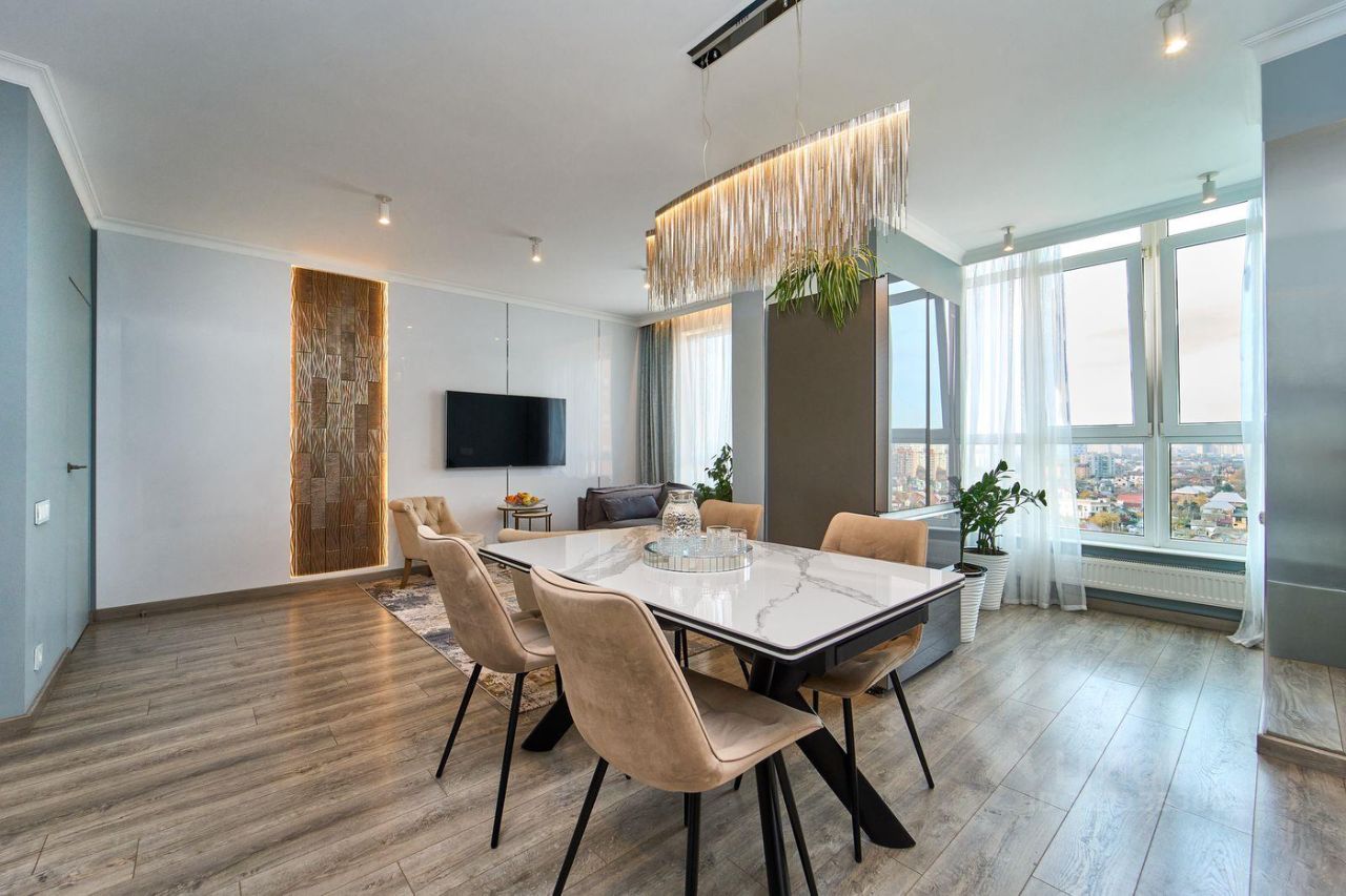 Общая площадь 100 м2 с панорамным видом из всех окон. Шикарная планировка с кухней-гостинной 31,6 кв.м., тремя изолированными комнатами и двумя санузлами.