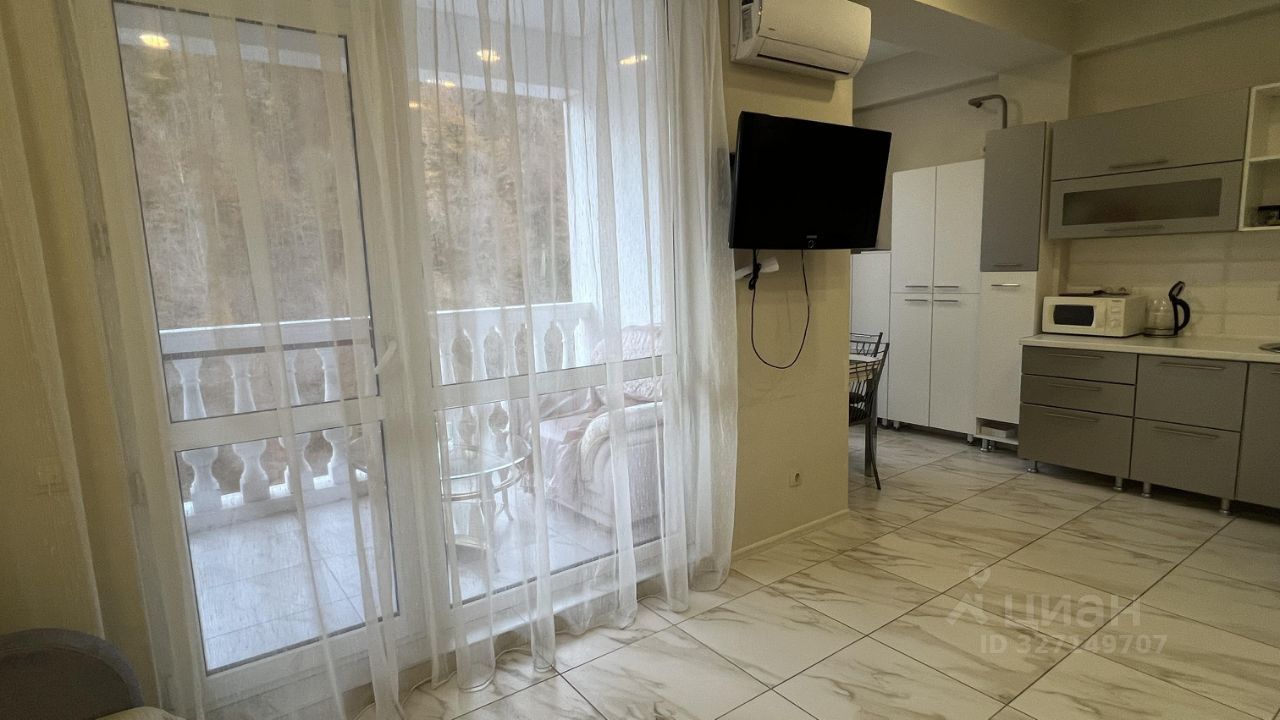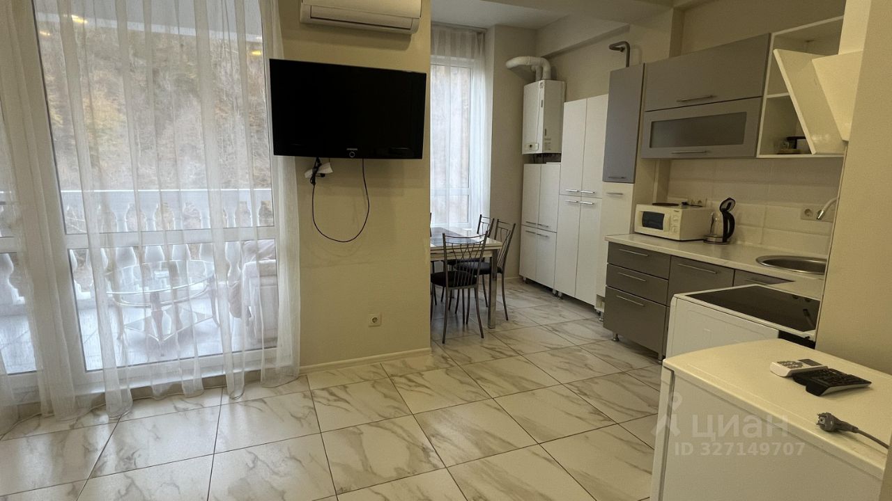 В квартире сделан качественный евроремонт, а также есть вся необходимая мебель и техника: кондиционер, холодильник, телевизор и стиральная машина. Удобная планировка позволяет максимально эффективно использовать пространство. В совмещённом санузле установлена душевая кабина. Балкон — отличное место для отдыха на свежем воздухе, откуда открывается приятный вид на горы и реку