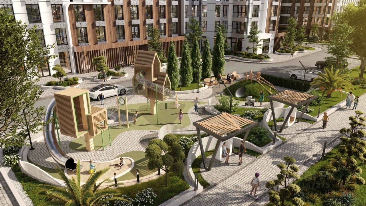 На закрытой территории комплекса выполнен ландшафтный дизайн, установлены безопасные детские площадки для детей всех возрастов, места для отдыха, зоны барбекю с беседками, спортивные площадки, установлен открытый бассейн. На территории также оборудована своя набережная протяженностью в 1,2км.