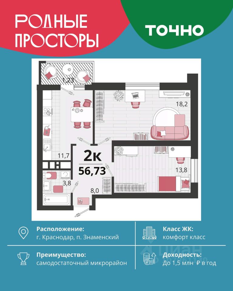 ''Родные просторы''- самодостаточный микрорайон, который реализован по принципу комплексного развития территории, где есть вся инфраструктура для комфортной жизни. На территории 41 га 29 домов от 9 до 24 этажей, уютные дворы со спортивными и игровыми площадками, социальные и коммерческие объекты, зеленые массивы и фонтаны. Главная точка притяжения ''Родных просторов'' - парк семейного отдыха площадью 9 га, 4,5 км прогулочных аллей, амфитеатр для мероприятий, кинофестивальная площадка. Особая гордость микрорайона современная школа на 1550 мест и 3 детских сада ''Ладушки'', ''Веснушки'' и ''Топотушки'' на 880 малышей. В центре микрорайона строятся фитнес-клуб BALANCE с акватермальным комплексом и собственная поликлиника, площадью более 5000 кв.м.