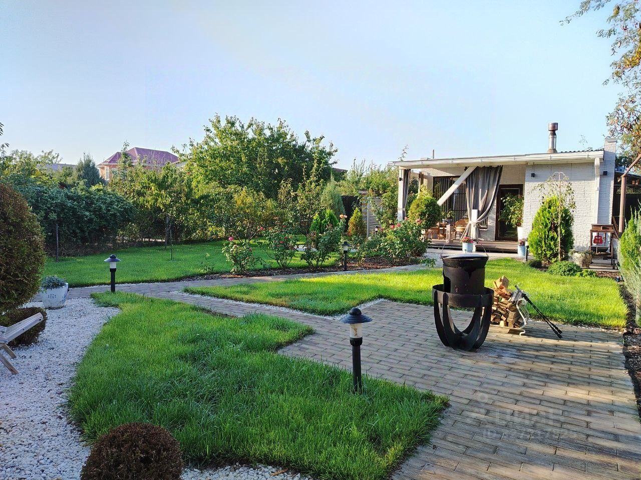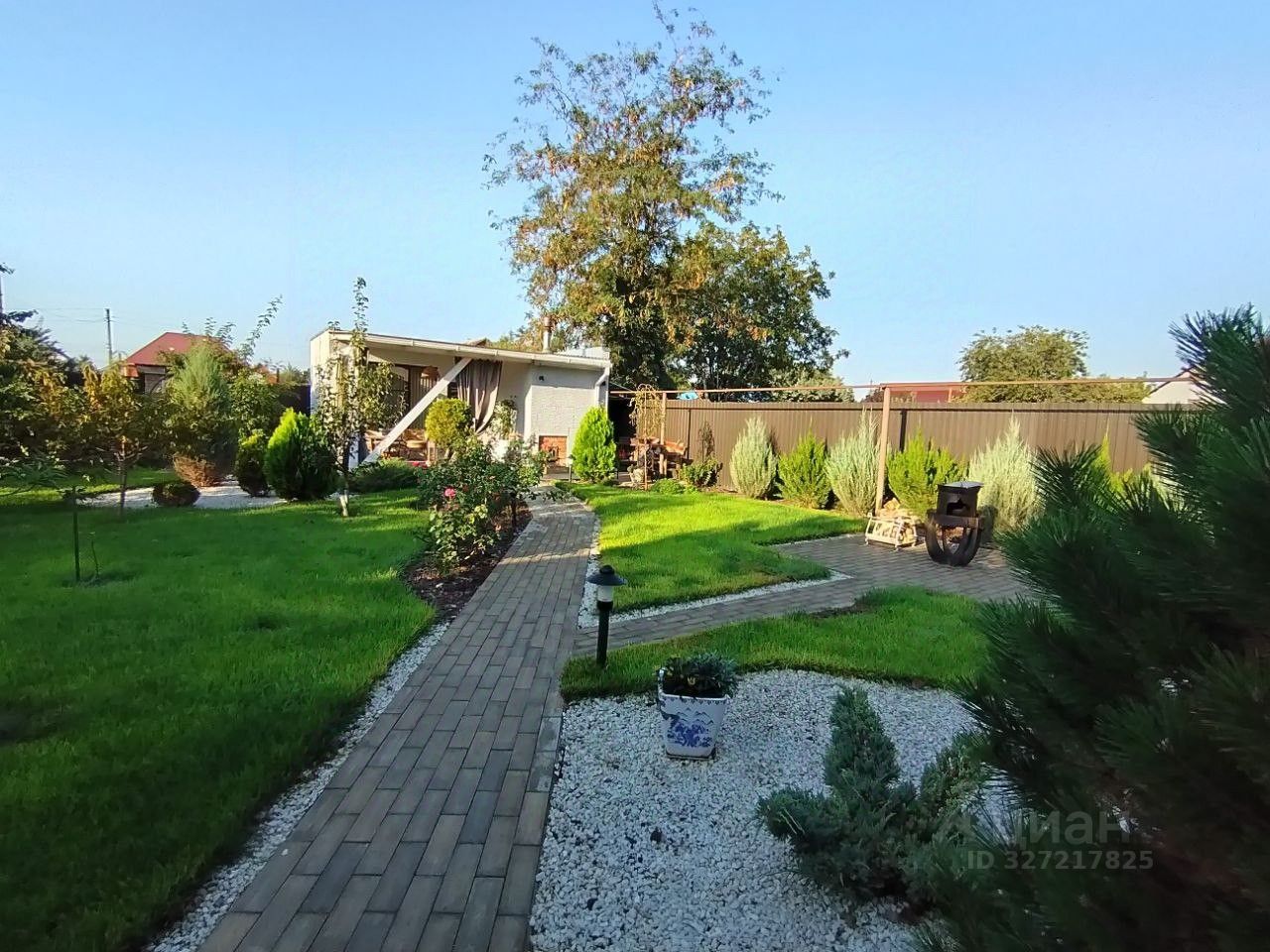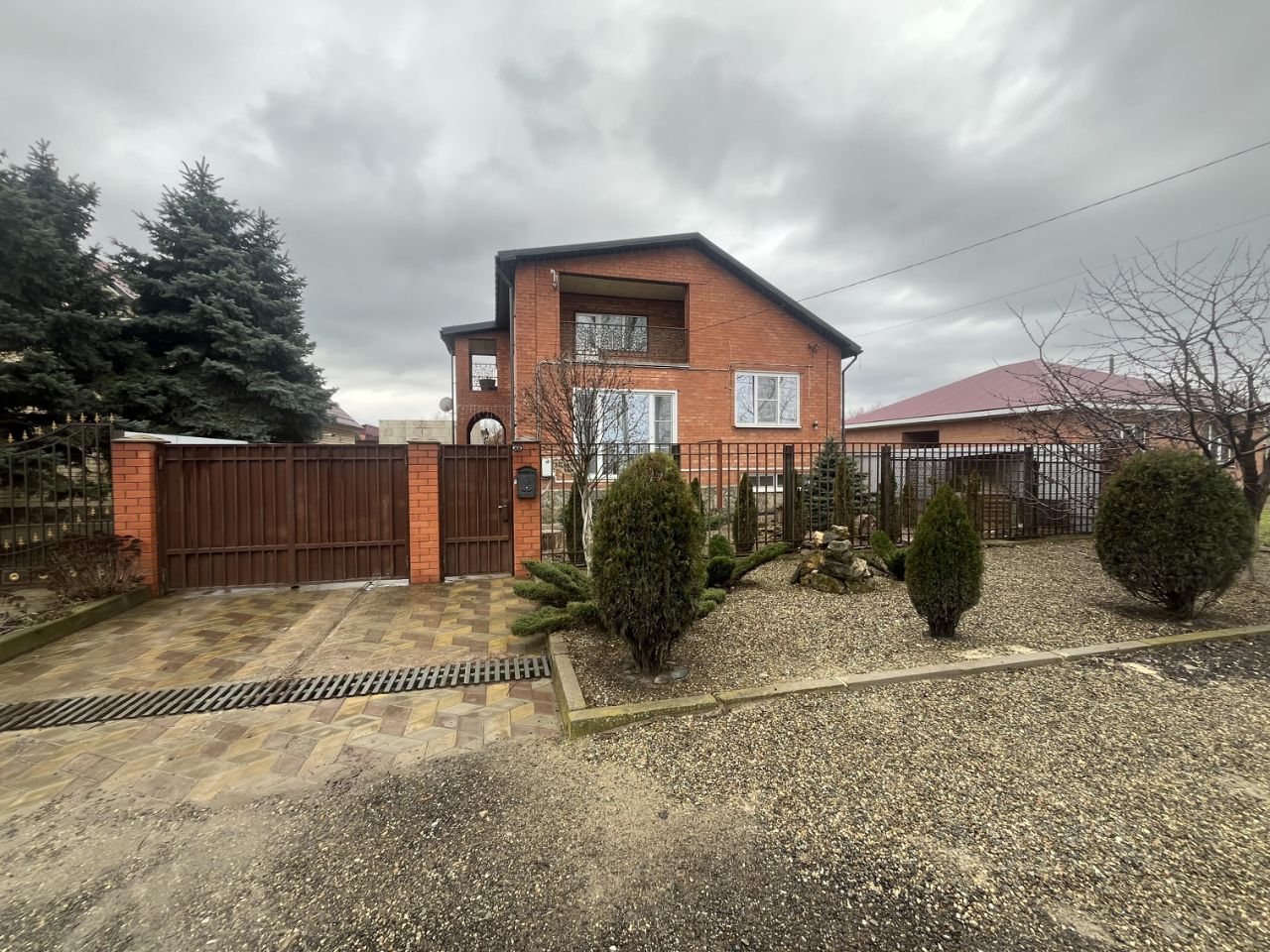Придомовая территория благоустроена тротуарная плиткой. Подъезд к дому дополнительно отсыпан щебнем, возле дома ухоженные клумбы с декоративными кустарниками, забор и ворота металлические.