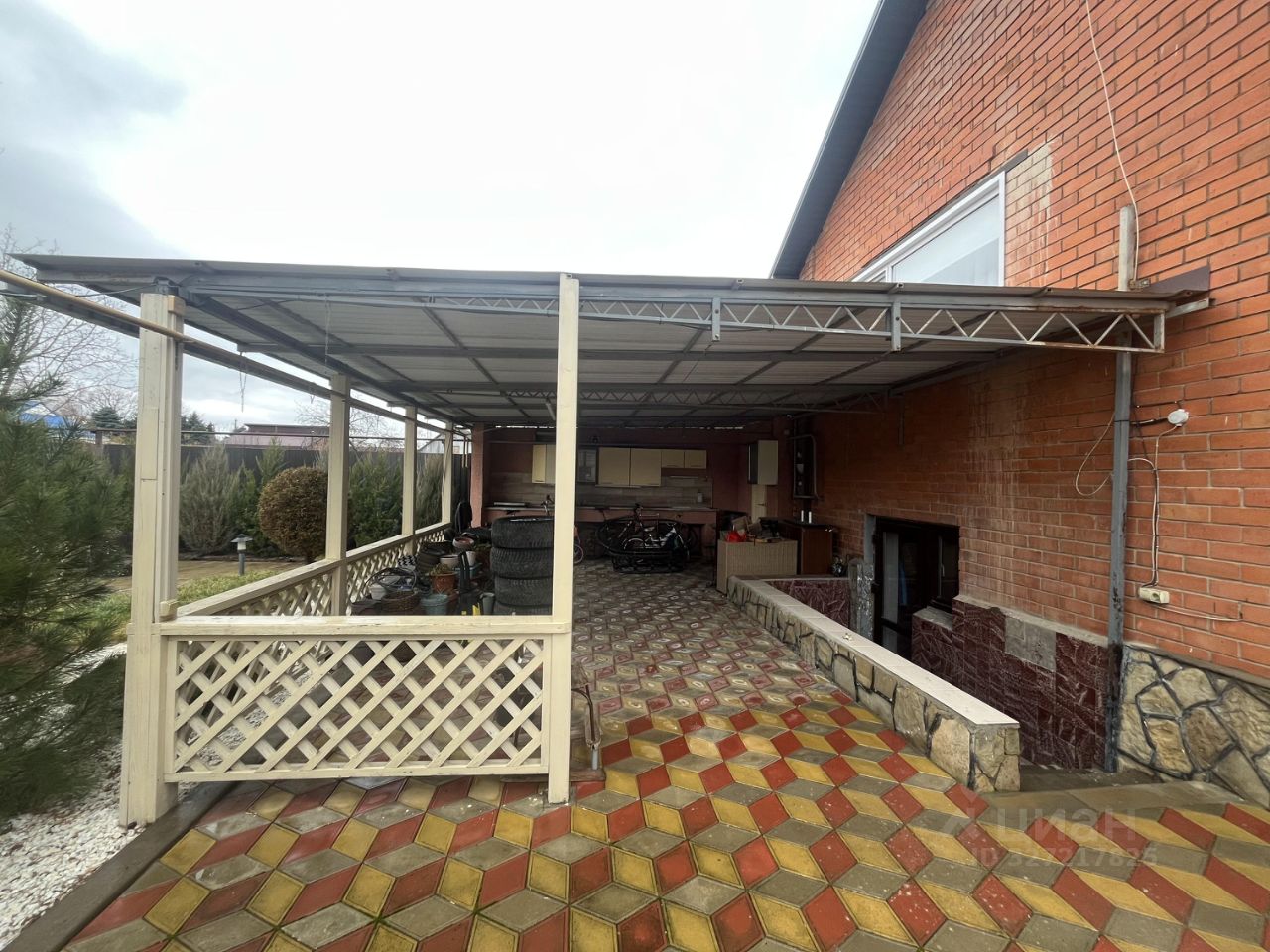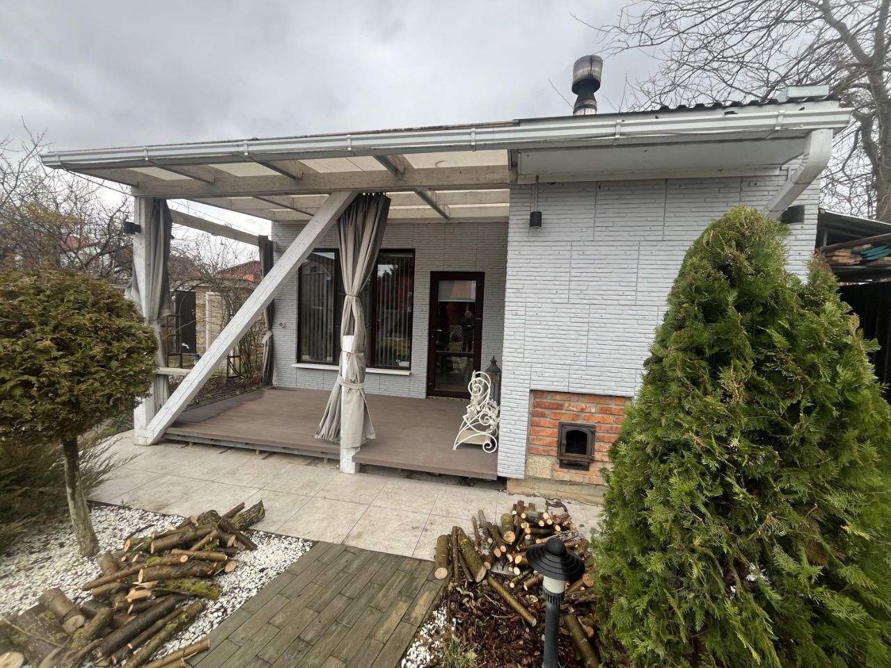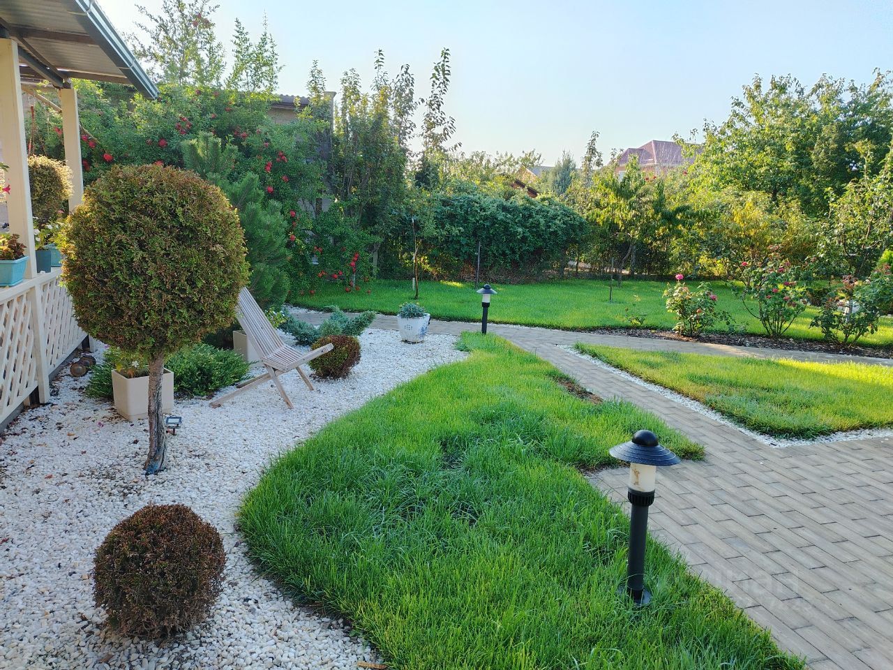 Придомовая территория благоустроена тротуарная плиткой. Подъезд к дому дополнительно отсыпан щебнем, возле дома ухоженные клумбы с декоративными кустарниками, забор и ворота металлические.