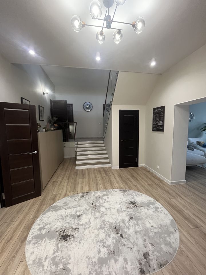 На 1 этаже расположен просторный холл (23,6 кв м), 3 жилых комнаты (16,2/ 19,3/ 31,4 кв м), кухня (22,5 кв м), раздельный санузел, терраса. Теплые полы в холле, гостиной, туалете, ванной.