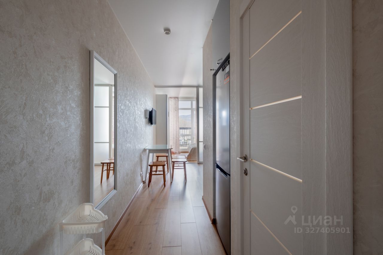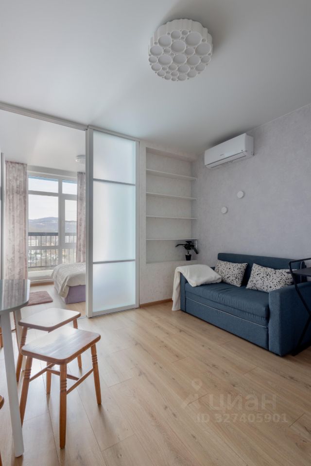 Почему вам здесь понравится: • Грамотное зонирование: Стильная перегородка с дверями-купе отделяет уютную спальню от зоны кухни-гостиной. По факту вы получаете функционал полноценной однокомнатной квартиры. • Вид, который вдохновляет: Окна выходят не на соседние окна, а на стадион, гимназию и величественные горы. Много зелени и воздуха!